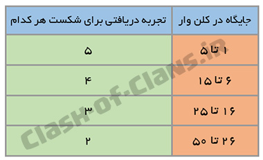 در جدول زیر میران تجربه دریافتی با توجه به جایگاه افراد را مشاهده می کنید."برای مثال اگر شما نفر 8 دشمن را شکست دهید، 4 تجربه برای کلن بدست می آورید