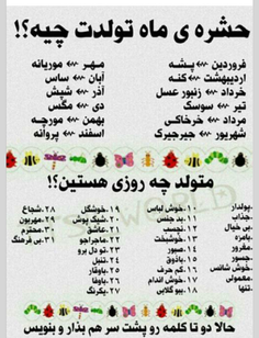 ♈️ فروردین ☘️ 😊جنبه مثبت ماجراجو، پرجنب وجوش، پیشگام ومتهور، پرشوق واطمینان بخش، پویا وحاضرجواب 😡جنبه منفی خودخواه,، عصبی، شتاب زده، کم طاقت وصبر، بی احتیاط ونترس ♪ ♫ ♪ ♫ ♪ ♫ ♪ ♪ ♫ ♪ ♫ ♪ ♉️ اردیبهشت ☘️ 😊 جنبه مثبت صبور، باپشتکار و قابل اعتماد، مهربان و دلسوز و بامحبت، بااستقامت مصمم وقاطع، ارام وخونسرد، اطمینان بخش 😡جنبه منفی حسود و انحصارطلب، غضب الود، انعطاف ناپذیر ویک دنده، لذت جو، خودخواه، ازمند ♪ ♫ ♪ ♫ ♪ ♫ ♪ ♪ ♫ ♪ ♫ ♪ ♊️ خرداد ☘️ 😊 جنبه های مثبت انعطاف پذیر، خوش مشرب، خوش محبت، بذله گو، شاداب، باطروات و پرتحرک، سرزنده، خلاق 😡جنبه منفی عصبی ونگران، بی ثبات ودمدمی، ناقلا، فضول و کنجکاو، ظاهربین ♪ ♫ ♪ ♫ ♪ ♫ ♪ ♪ ♫ ♪ ♫ ♪ ♋️ تیر 🌿 😊 جنبه مثبت عاطفی، احساساتی، بامحبت ومهربان، درون بین، خلاق، هوشیار ومحتاط، دلسوز 😡جنبه منفی دمدمی، بی ثبات، بدخلق وعبوس، زودرنج، حساس ونازک نارنجی، وابسته وحالت چسبندگی ♪ ♫ ♪ ♫ ♪ ♫ ♪ ♪ ♫ ♪ ♫ ♪ ♌️ مرداد 🌿 😊 جنبه مثبت دست ودل باز، سخاوتمند، بلندنظر، مهربان و رئوف ودلسوز، خلاق، مشتاق وپرشور، روشنفکر فهمیده، حراف، گرم وسرحال، باوفا، با وجدان واصیل 😡جنبه منفی خودبین و خودپسند، ضعیف نواز، مستبد، ریاست طلب، فضول و متقلب، کم عقل، خودکامه، ناشکیب ♪ ♫ ♪ ♫ ♪ ♫ ♪ ♪ ♫ ♪ ♫ ♪ ♍️ شهریور 🌿 😊 جنبه مثبت متواضع، فروتن، کم توقع، باحیا، متعادل، افتاده، ملاحظه کار، محتاط وکمرو، بسیاردقیق وموشکاف، قابل اعتماد، واقع بین، اهل عمل، کاری، سخت کوش، زیرک وباهوش 😡جنبه منفی ایرادی، وسواسی، حساس، عصبی، غصه خور، دلشوره ای، نگران، نق نقو، بی رحم، سختگیر، کهنه گرا ♪ ♫ ♪ ♫ ♪ ♫ ♪ ♪ ♫ ♪ ♫ ♪ ♎️ مهر 🍁 😊 جنبه مثبت باتدبیر، باسیاست، مؤدب و بانزاکت، اداب دان، احساساتی، خیال پرداز، دلربا، جذاب وملیح، بردبار، پرتحمل، اسان گیر، اجتماعی، خوش مشرب، خونگرم، معاشرتی، صلح جو و ارام 😡جنبه منفی دودل و نامطمئن، خوش باور و تأثیرپذیر، خودخواه ولوس ♪ ♫ ♪ ♫ ♪ ♫ ♪ ♪ ♫ ♪ ♫ ♪ ♏️ آبان 🍁 😊 جنبه مثبت مصمم، قاطع، بااراده، پرقدرت، محکم ونیرومند، جذاب وگیرا، عاطفی واحساسی، مقتدر و بانفوذ، پرشور و حرارت و مهیج 😡جنبه منفی حسود، غیرتی، خشمگین، غضب الود، وسواسی، بی اختیار، تودار، پنهان کار، مرموز، لجوج، یک دنده و سختگیر، خود رأی ♪ ♫ ♪ ♫ ♪ ♫ ♪ ♪ ♫ ♪ ♫ ♪ ♐️ آذر 🍁 😊 جنبه مثبت خوش بین، خوش خلق، مهربان، خونگرم و شاد، درستکار وصادق، شریف و بی غل وغش، اندیشمند و روشنفکر، فیلسوف منش 😡جنبه منفی خوشبین و بی خیال، بی دقت، بی احتیاطی، بی توجهی، ظاهربین، بی ملاحظه، بی مسؤلیت، بی قرار و ناارام ♪ ♫ ♪ ♫ ♪ ♫ ♪ ♪ ♫ ♪ ♫ ♪ ♑️ دی ❄️ 😊 جنبه مثبت واقع بین، اهل عمل، دوراندیش، محتاط، حسابگر، معتقد، جاه طلب، خاص ، خوش مشرب ، شکیبا، دقیق، شوخ طبع، همه فن حریف ، شاد ، پر تحرک ، دارای حافظه قوی 😡جنبه منفی بدبین، تقدیرگرا ، انعطاف ناپذیر، مقرارتی، جدی و سختگیر، بد خشم ، شیطون ، نترس ♪ ♫ ♪ ♫ ♪ ♫ ♪ ♪ ♫ ♪ ♫ ♪ ♒️ بهمن ❄️ 😊 جنبه مثبت مهربان و صمیمی، انسان دوست، صادق و درستکار و شریف، خلاق، مستقل، بی نیاز، بدون وابستگی، ازاد، عاقل و متفکر و اندیشمند 😡جنبه منفی سرکش، نافرمان، لجوج و خودرأی، غیرقابل پیش بینی، پرتحرک وشاد ♪ ♫ ♪ ♫ ♪ ♫ ♪ ♪ ♫ ♪ ♫ ♪ ♓️ اسفند ❄️ 😊 جنبه مثبت خلاق، تحلیل قوی، حساس، زودرنج، دلسوز و دل رحم، مهربان، ازخودگذشته، فداکار، نوع دوست، باتجربه، همدل وهمفکر،منطقي و صادق،جذاب 😡جنبه منفی واقع گریز،تودار،زودباور و مبهم، سست اراده، به راحتی تحت سلطه قرار . . . ❤ *@***/*